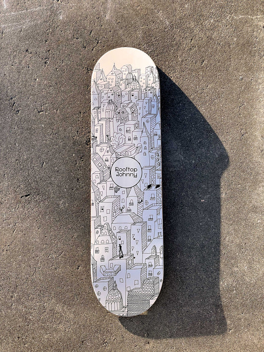 Dive into the world of skateboarding with Rooftop Johnny’s custom-designed skateboard decks. Perfect for vert and street.