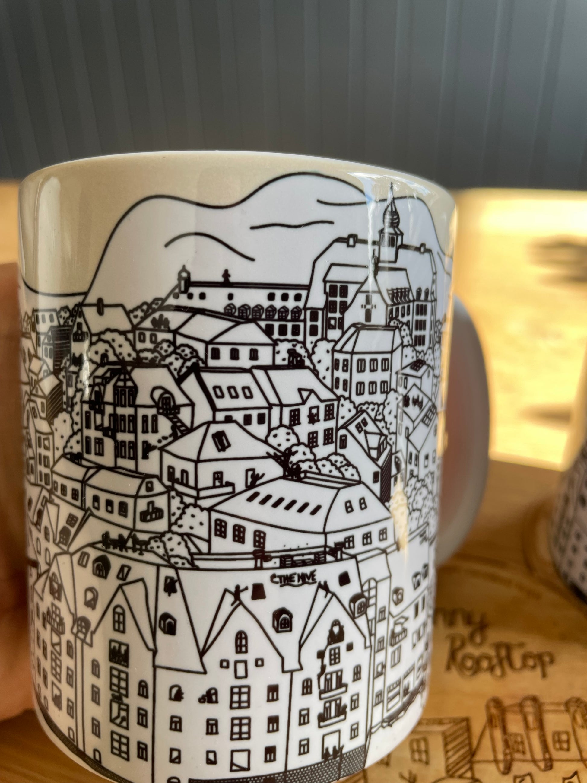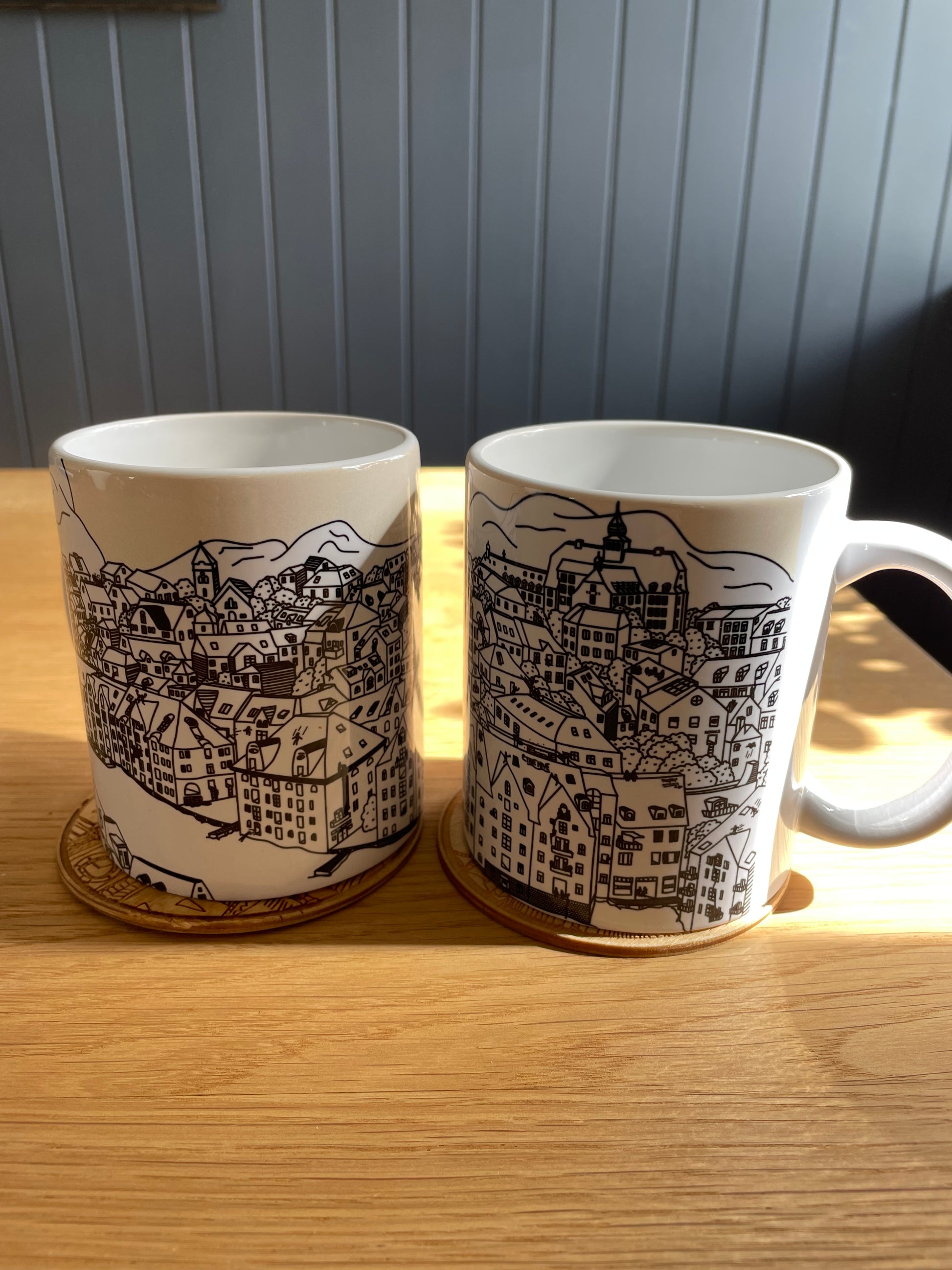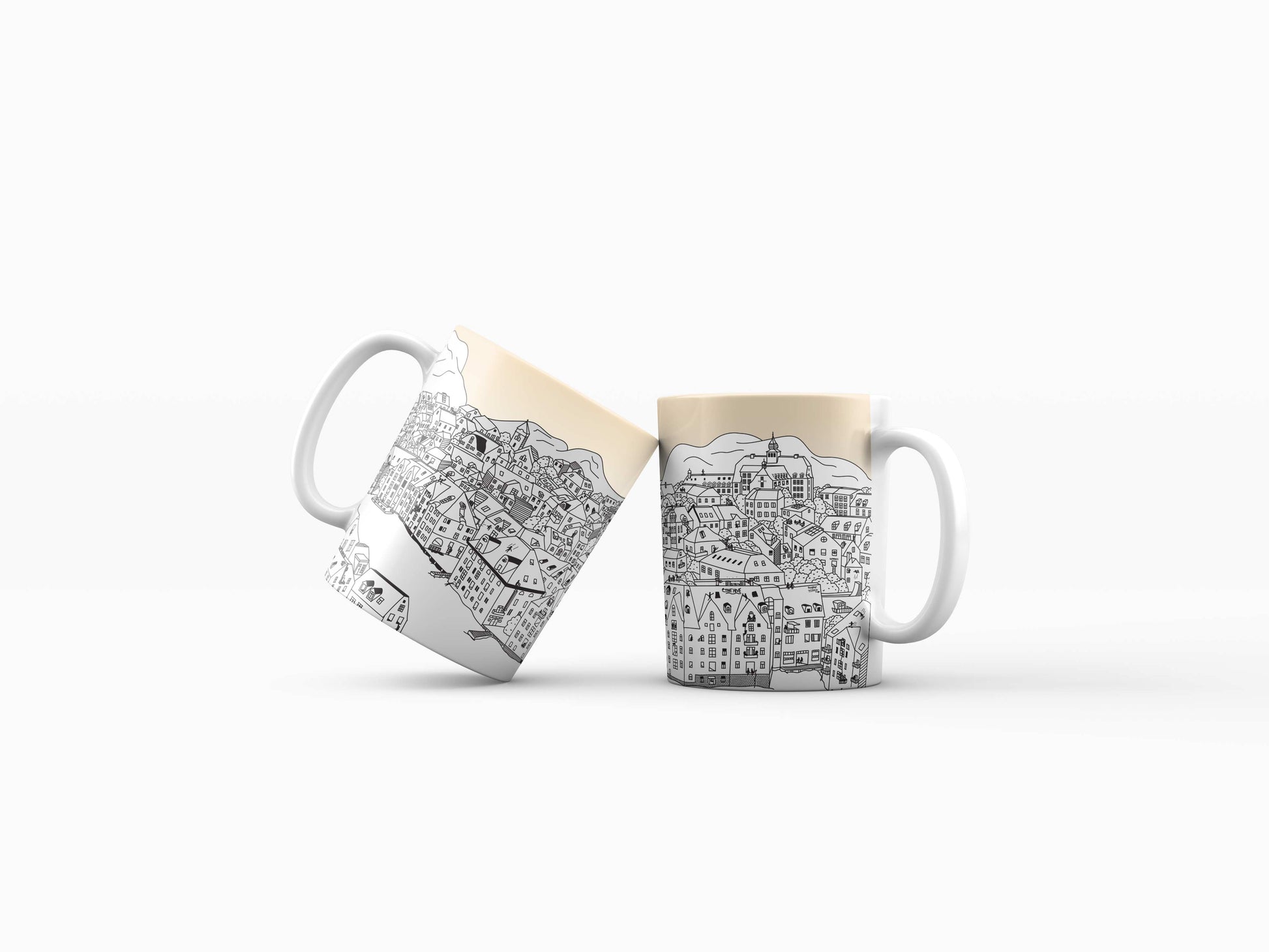 Take a break with our Ålesund Coffee Mug! This unique mug features a beautiful hand-drawn illustration of the rooftops of Ålesund.