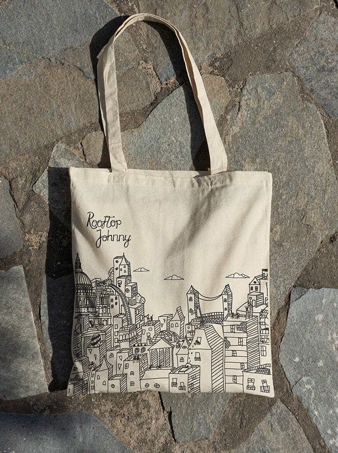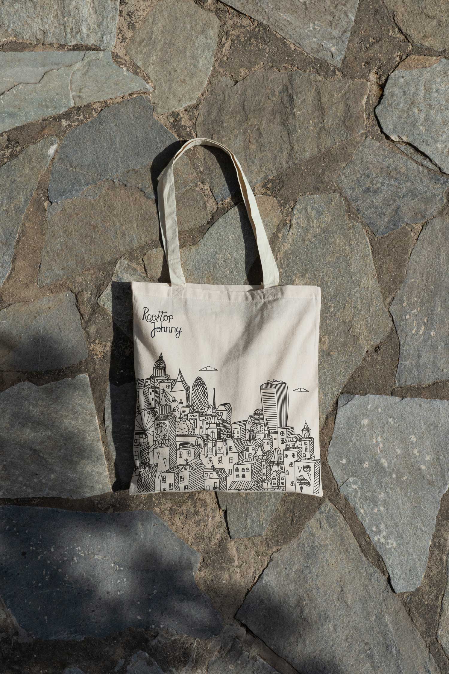 Introducing our sustainable and versatile tote bag, Rooftop Johnny Cotton Tote bag, London edition. A perfect blend of eco-conscious fashion and functional design. Crafted in a natural hue, this tote features a unique and custom design that adds a touch of individuality to your everyday style. Made from 100% cotton, it's a statement of sustainability you can proudly carry. With its 30cm long shoulder handles and a large main compartment. Whether it's for carrying heavy books or groceries, this net is designed to meet all needs. 220 g/m² cotton ensures durability and reliability. Made in India and OEKO-Tex certified. Weight up to 10 kg.
