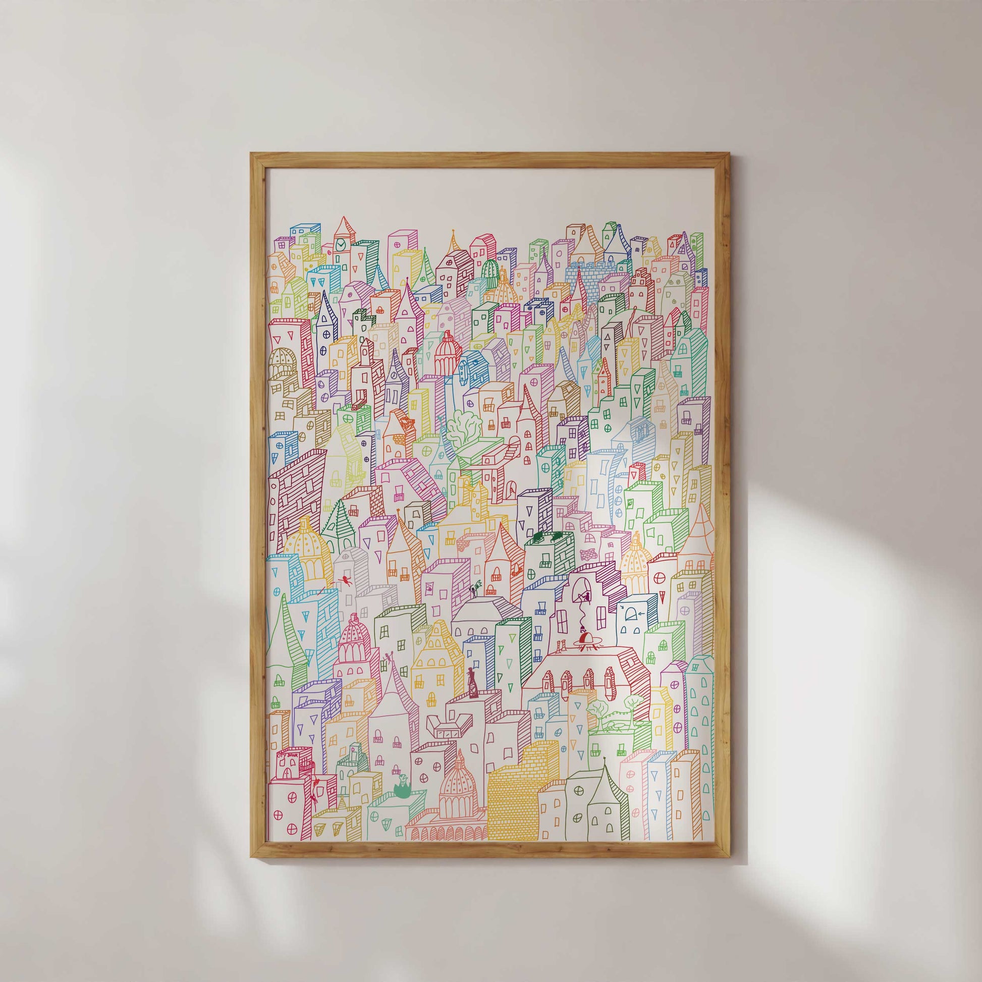Our "Too Many Rooftops 2.0" poster is the second print in the Too Many Rooftops-series. This print is more than just wall decor; it's a visual journey that invites you to explore the city from a unique perspective. Original hand drawn illustration by Rooftop Johnny, followed by digital touch.